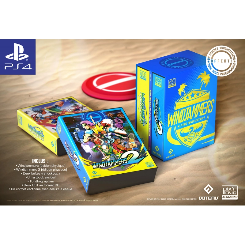 Réalisée par des fans pour des fans, l'offre Flying Power Edition regroupe les éditions Collector de Windjammers & Windjammers 2 dans un superbe coffret numéroté. Assorti d'une couleur Pantone et d'une dorure à chaud, cet écrin intègre un artbook inédit de 120 pages présentant des documents de conception inédits de Windjammers & Windjammers 2. L'équipe de développement livre également ses secrets de conception en vous dévoilant les coulisses du développement de Windjammers 2 dans un entretien exclusif.