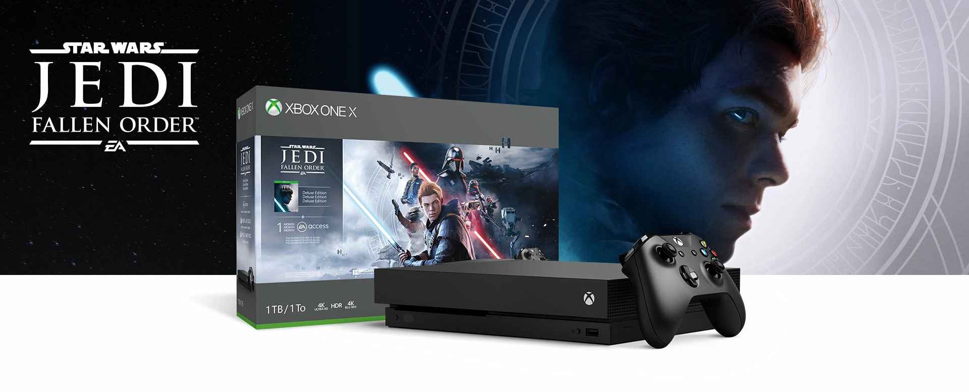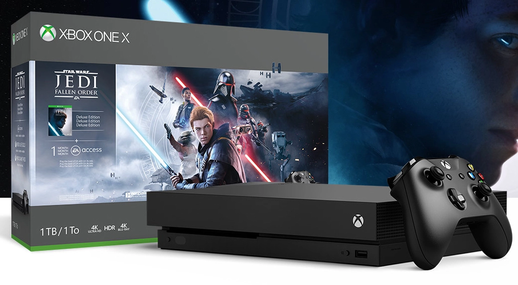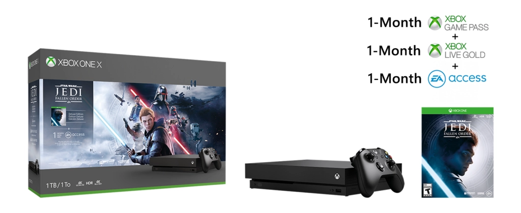 - Le pack inclut :* Une console Xbox One X 1 To, une manette sans fil Xbox, un téléchargement complet du jeu Star Wars Jedi: Fallen Order Édition Deluxe, un mois de Xbox Live Gold, un mois d'essai du Xbox Game Pass pour console et un mois d'EA Access.†