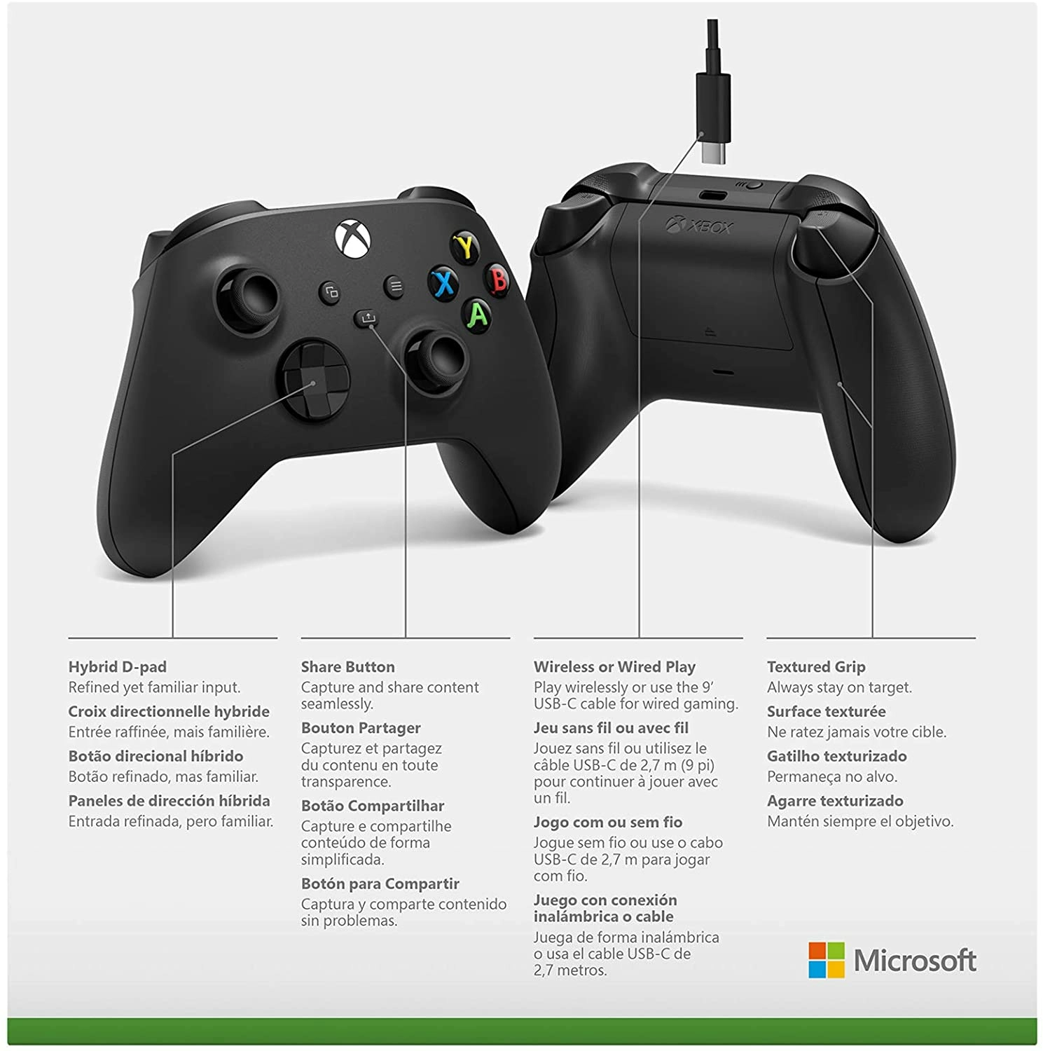 Découvrez la nouvelle manette sans fil Xbox avec cable pour PC. Jouez sans fil ou utilisez le câble USB C inclus Gagnez en précision grâce à sa croix directionnelle modernisée et améliorée. Profitez d’une meilleure prise en main et d’un confort de jeu accru avec ses surfaces texturées. Utilisez l'application Xbox Accessories pour redéfinir les boutons et créer des profils de manettes personnalisés pour vos jeux préférés*. Associez et passez rapidement d'un PC Windows 10 à un téléphone, Xbox Series X|S, Xbox One, Android, ou à une tablette. Branchez tout casque compatible avec la prise audio jack 3,5 mm.