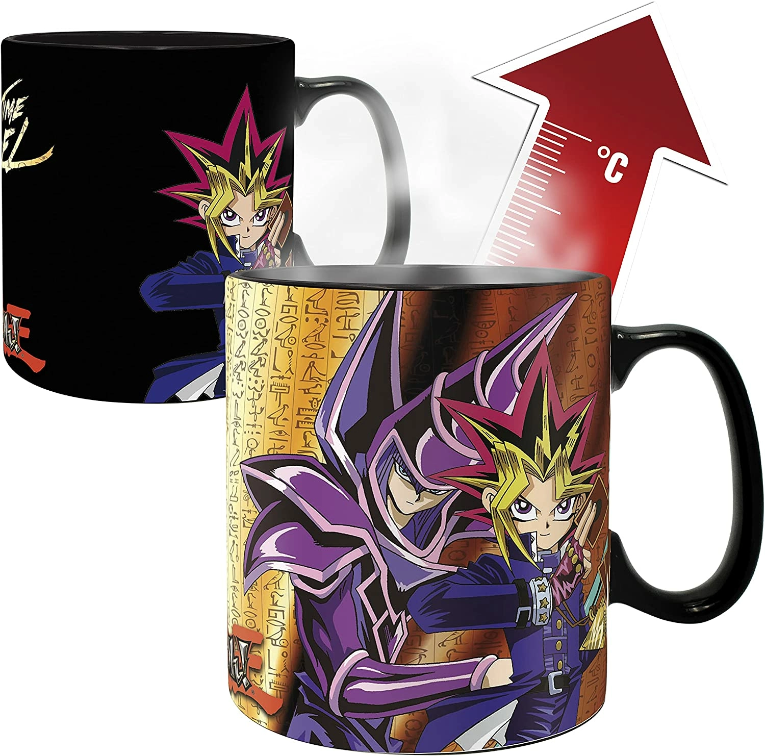 Quel que soit le moment, il sera dorénavant l'heure du duel avec ce mug thermo-réactif Yu-Gi-Oh par ABYstyle ! Choisissez votre camp, versez votre boisson chaude et invoquez vos monstres dans un combat épique !Tous les matins, vous verrez désormais votre mug changer d'apparence lorsque vous ferez couler votre chocolat chaud, votre thé ou votre café... !Caractéristiques :- Change d'aspect lorsque vous versez un liquide chaud.- Grande contenance (460 ml).- Matière : céramique.- Ne passe pas au micro-ondes ou au lave-vaisselle
