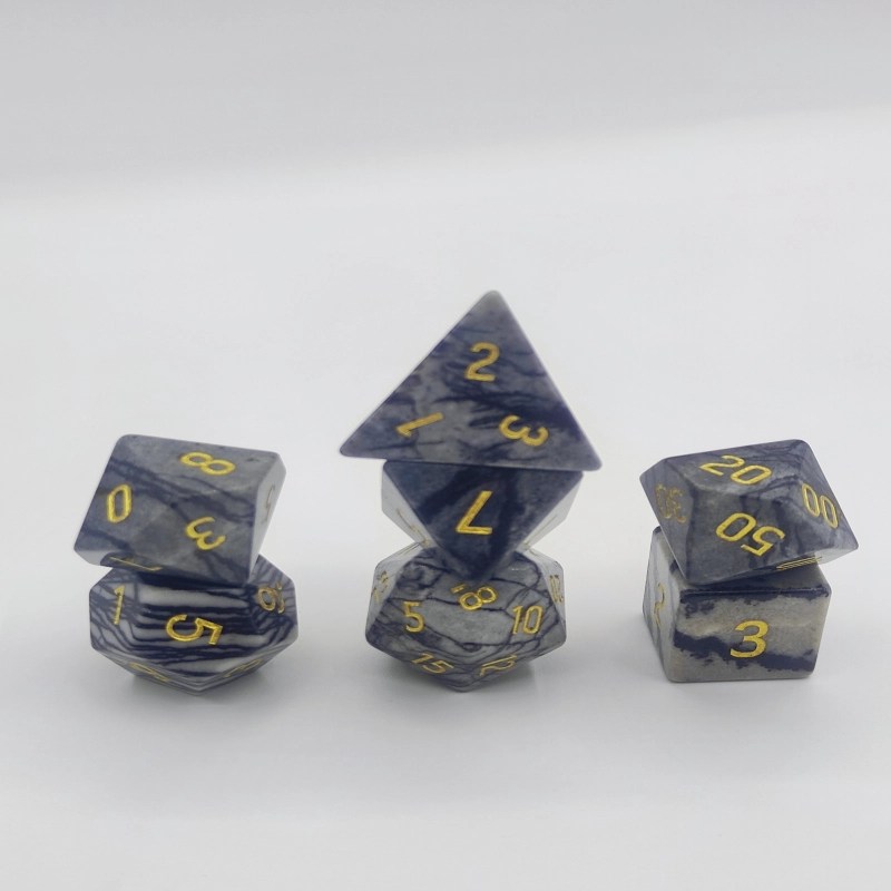 Découvrez Dés pierre semi précieuse - lot de 7 dés avec boite en métal- naturelle- jaspe internet gris sur Référence Gaming.